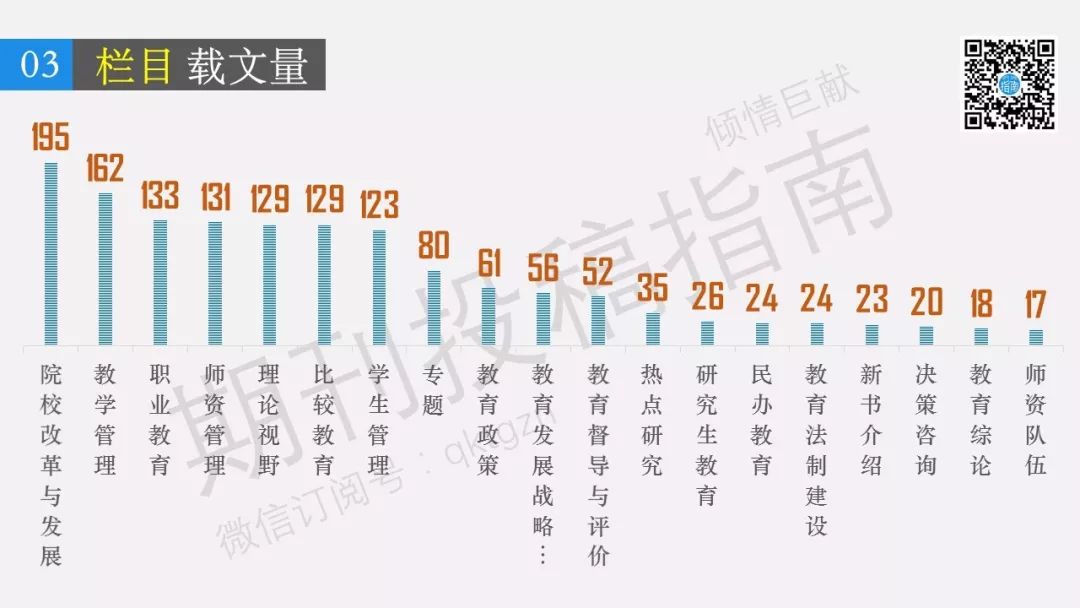 2016-2018年《 现代教育管理》大致情况如下:最近3年共计发文722篇,平均发文字数7136字。最近3年文章基金比81%:国家自科基金占比3%;国家社科基金占比14%;教育部基金占比26%;其他省级基金与博士后等基金占比57%。近3年在《现代教育管理》发文的单位共计867个:其中,各类研究中心|协会|研究所(院)约占4%;大学(含研究中心、所、院)约占71%;职业技术学院与专科学校约占5%;其他单位未具体统计的单位约占20%。