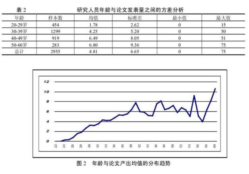 将研究人员年龄以 10 岁为一个年龄段进行划分后,年龄段与论文产出量之间的方差分析结果显示,随着研究人员的年龄层次升高,其论文产出量显著增加(见表 2)。但在对年龄(连续)与论文产出量均值的分布趋势进行描述后,可以看出,研究人员的论文产出量呈现多峰分布,40-42岁为论文产出的第一个峰值,然后 46-48 岁又是一个产出高峰,转而在 54-56 岁再形成一个产出峰值,令人不解的是,在 58-60 岁这个年龄段,研究人员的产出量又显著增加。就总体趋势而言,研究人员的年龄越大,其论文产出量越多。